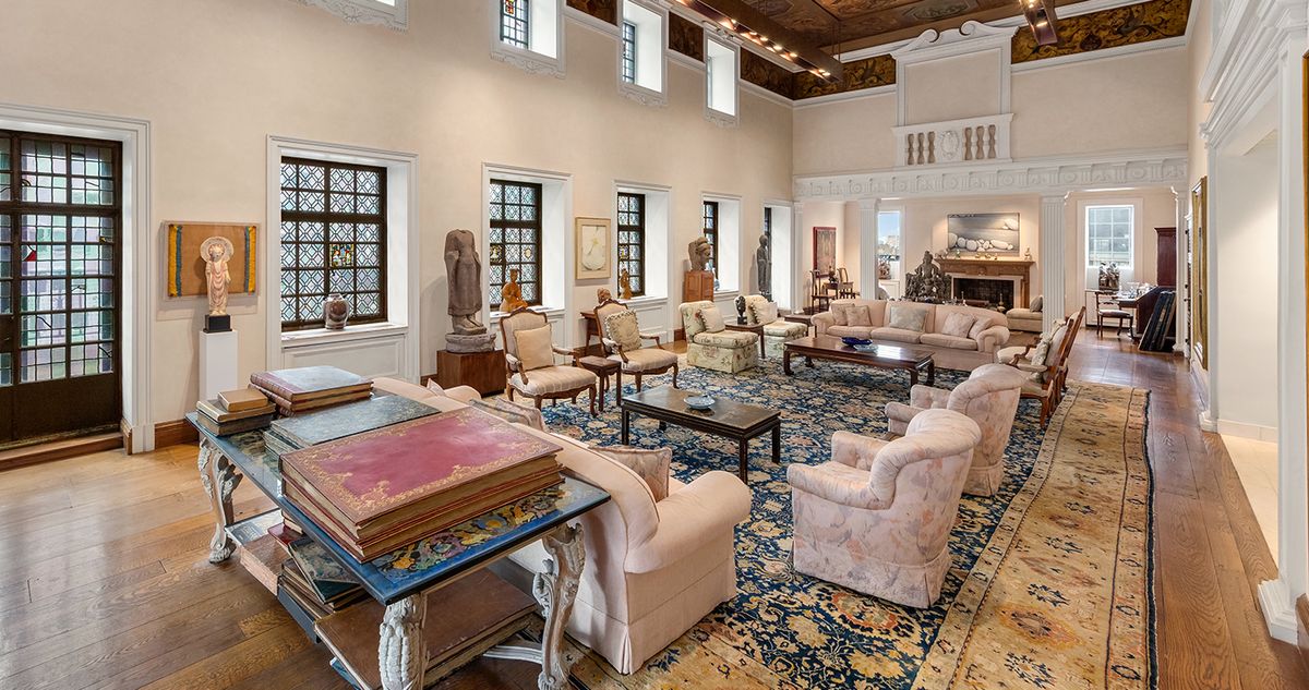 The Developer of the Ritz TowerA 1926 CO-OP ON THE CORNER OF 57TH AND PARK, DIDN’T GIVE HIMSELF The Penthouse on the 41st Floor-THEN, The City’s Highest Residence. Instead, he chose floors 19 and 20, where the building steps inward, with room for a terrace on three sides. Designed by Emery Roth, the King of Prewar Elegance, the Ritz Tower Got an edit from the FROTHIECTS at Carrère and HastingsWho Covered the Exterior With Cartouches, Scrolls, and Urns. The owner’s terrace has a huge obelisk, and it was thomas hastings who personally designated The interiors arund a 45-Foot-Long great room, which he tourned into a medieval Hall with a bit of Italy palazzo. (A juliet balcony with columns and arches overheed over the room from a gallery on the second Floor.) Acciting to the Listeningand the terrace can be seen through leadd Windows and doors freckled with stained Glass, some with medieval-style images of masks and angels. There’s a Wood-Burning Fireplace, and the Wood Floors Might ALSO Be Hand-Crafted Antiques: Hand-Carved Wooden Dowels Cover the Nails Holding Down Eight-Inch-Wide Slabs of Old Trees.