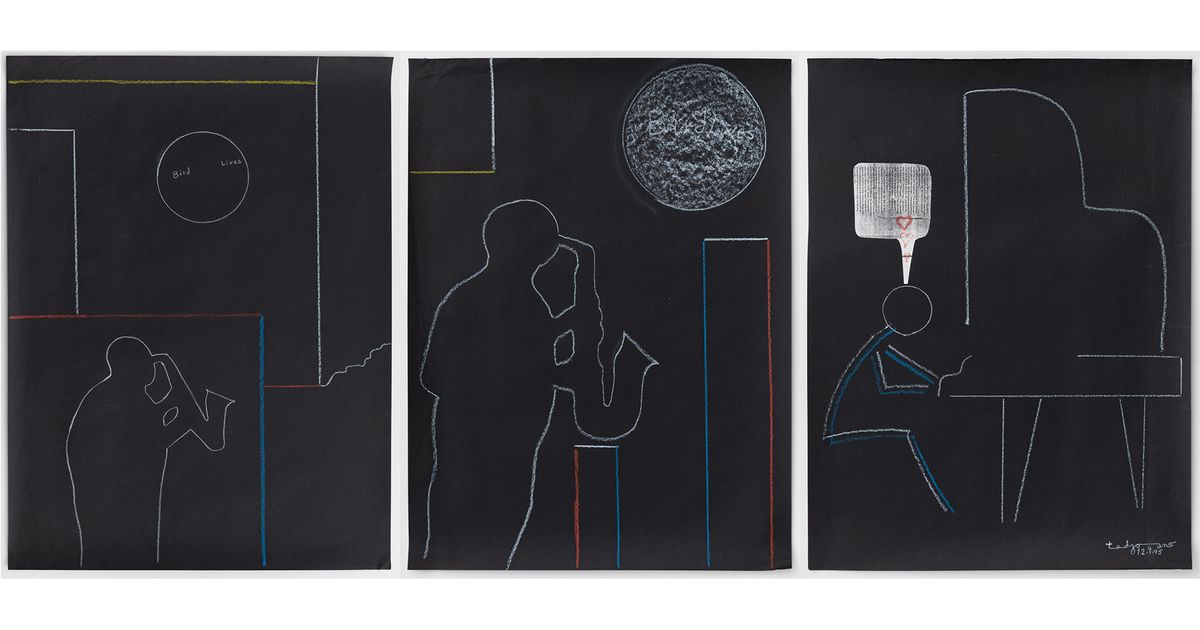 A Collage-Heavy version from 1998 Still Out Bird’s Hulking, Bearrik outline with unusually detailed limbs and a Photo Cutout of Parker, Turning Him Into Like a Jazz Centaur. Its swirling cacophony of rectangles – red, blue, lime – are staggered so as to leap off the page, exuding the freedom at the core of the technicolor music. There’s a hint of the colorful dutch abstractionist Piet Mondrian, whose work was itelf inspired by the boogie-woogie he heard in new York. Another Avian Piece from the Following Year Busily Overlays a Label-Heavy Scrap of Cardboard Box with “BIRD LIVES!” Silhouette and JANANS’S NAME IN JAPANESE Characters. Within the figure, “Charlie Parker” is Written over and Again, Like a Bart Simpson Chalkboard Punishment. At the the end of his life, Joans was Still Trying to Learn the lessons – The Weird Blues Transcendence – heard in jazz.