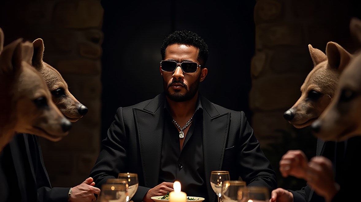وظهر محمد رمضان بالفيديو جالسًا على المائدة وحوله أشاص تحولت رؤوسهم إلى رؤوس بينما تحول رأسه هو أسد.