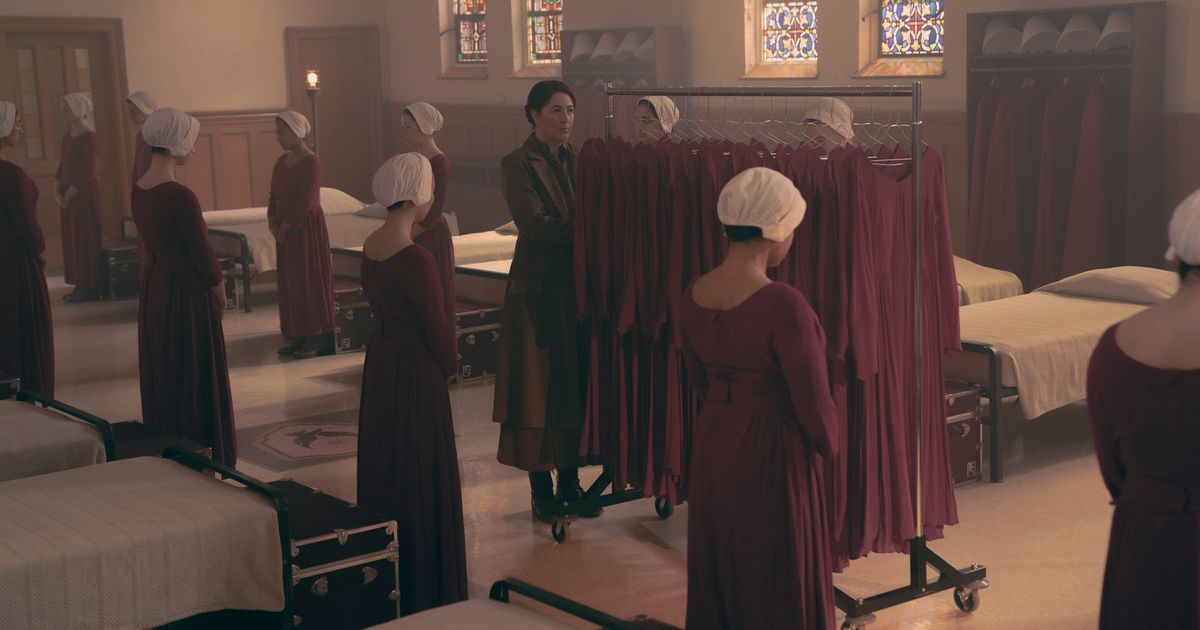 In “Exodus,” june draws a parallel between gilead’s uniforms and the Relationship the Last Americans Had with Buying Clothes: Ecologically destructive consumerism masquerading as self-expression. You are what you wear. By Controlling How People Dressed, Gilead Could Control How People Saw One Another. Maybe It Could Eve Control How People Saw Themselves: You are what you’re wearing. The Red Cloaks of the Handmaids – Plus the bonnets and masks – are particularly dehumanizing, anonymizing, physically restricting, and symbolically pregnant. June Tells us they’re the Color of Blood and “Rage.” Viewers will have seen the Apple Eve plucked from the tree of KnowLEDGE, HESTER PRYNNE’s Scarlet orand The Red Kimono, The suggestion of a theater curtain closing on the outside world.
