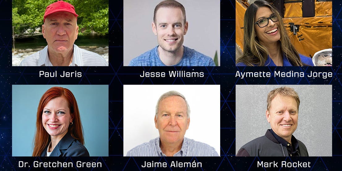 The Six Crew Members are Paul Jeris, Jesse Williams, Aymette Medina Jorge, Dr. Gretchen Green, Jaime Alemán, and Mark Rocket. Blue Origin