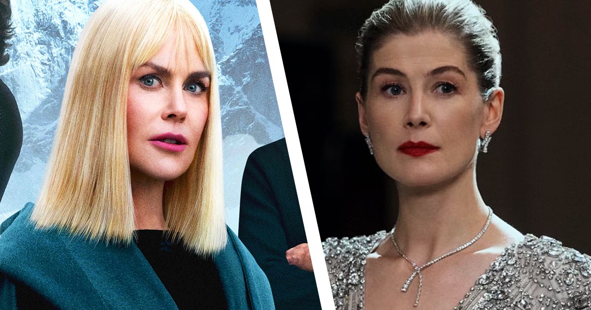 Monumental sequel trailers DROPPED TODAY, ACCOMPANIED BY TWO MORE MORE BREATTAKING POSters, Both of which Depict A Mysterious ICY BLONDE POSSIVE ON A FEARS SURROUNDED BY AN INTRORGUING COMposite of Recognizable Faces. One Image is for the Second Season of Hulu’s Liere Moriarty Adaptation, Nine Perfect Strangers, beating The White Lotus to the rumored punch by setting its Luxury Resort-Set Mystery in the Alps, Starring Nicole Kidman. The other is for Now You See Me, Now You don’t, The Third Film in the Jesse Eisenberg – Helmed Ensemble About Flashy Magicians Pulling off Elaborate Heists. Rosamund pike is a new villain in the franchise and thus gioven prominent placement standing down like an unnatural vampire. The Only Way for US to Cover This News Was to Put Both Works of Promo Art in conversation with Each Other, and to make Said Conversation especially Silly. SO we Ask, Who Would Win in An Avengers: Infinity War-Style Battle BetWeen These Intimidating Women and Their Respective Ensembles?