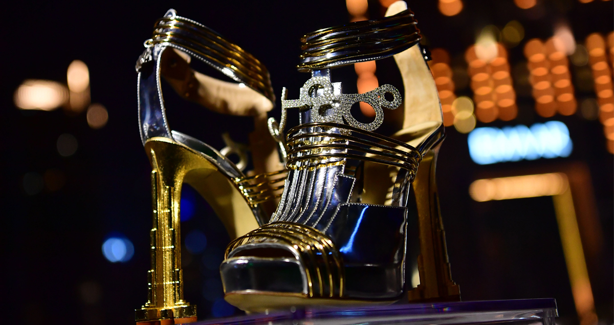Created by United Arab Emirates-based brand Jada Dubai in partnership with Passion Jewelers, the Passion Diamond Shoes went on display in September 2018 at the world’s only seven-star hotel, Burj Al Arab, in Dubai, United Arab Emirates. They were valued at $17 million at the time and reportedly took nearly nine months to produce, with the collaborating designers’ names inscribed in gold on the insoles. The soaring stilettos boast two 15-carat diamonds on the upper, adorned with hundreds more carats — all of them the exceptionally rare D flawless diamonds.