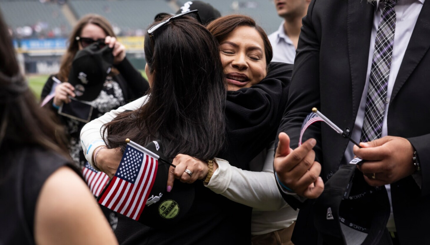 Felix came to the United States from Zacatecas, Mexico, in 1979. She Joined 24 Other Immigrants from A Total of 15 Countries Thursday in a Naturalization at Rate Field before the White sox-Detit Tigers Game. The new US Citizens Stood Proudly, Clutching Miniature American Flags As US District Judge Matthew Kennelly say to Raise Right Hands and Repeat the Oath of Allegiance.