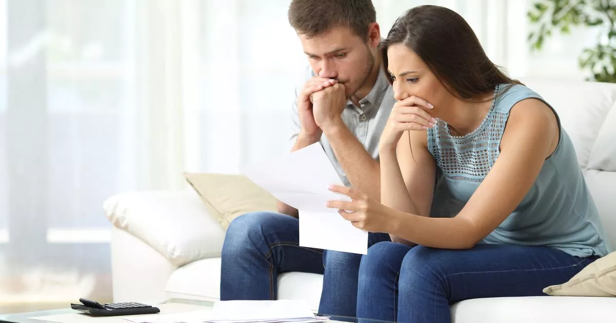 World Couple Reading an Important Notification in A Letter Sitting on a Couch in the Living Room at Home
