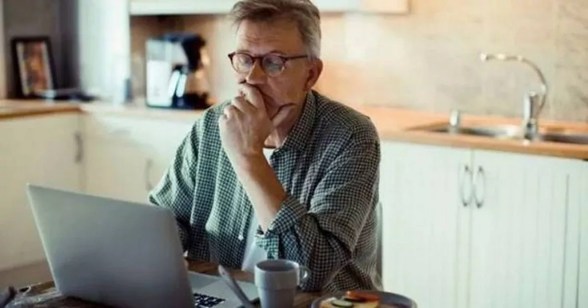 A pens looking man is reading something on a Computer Screen while Seated at A Kitchen Table