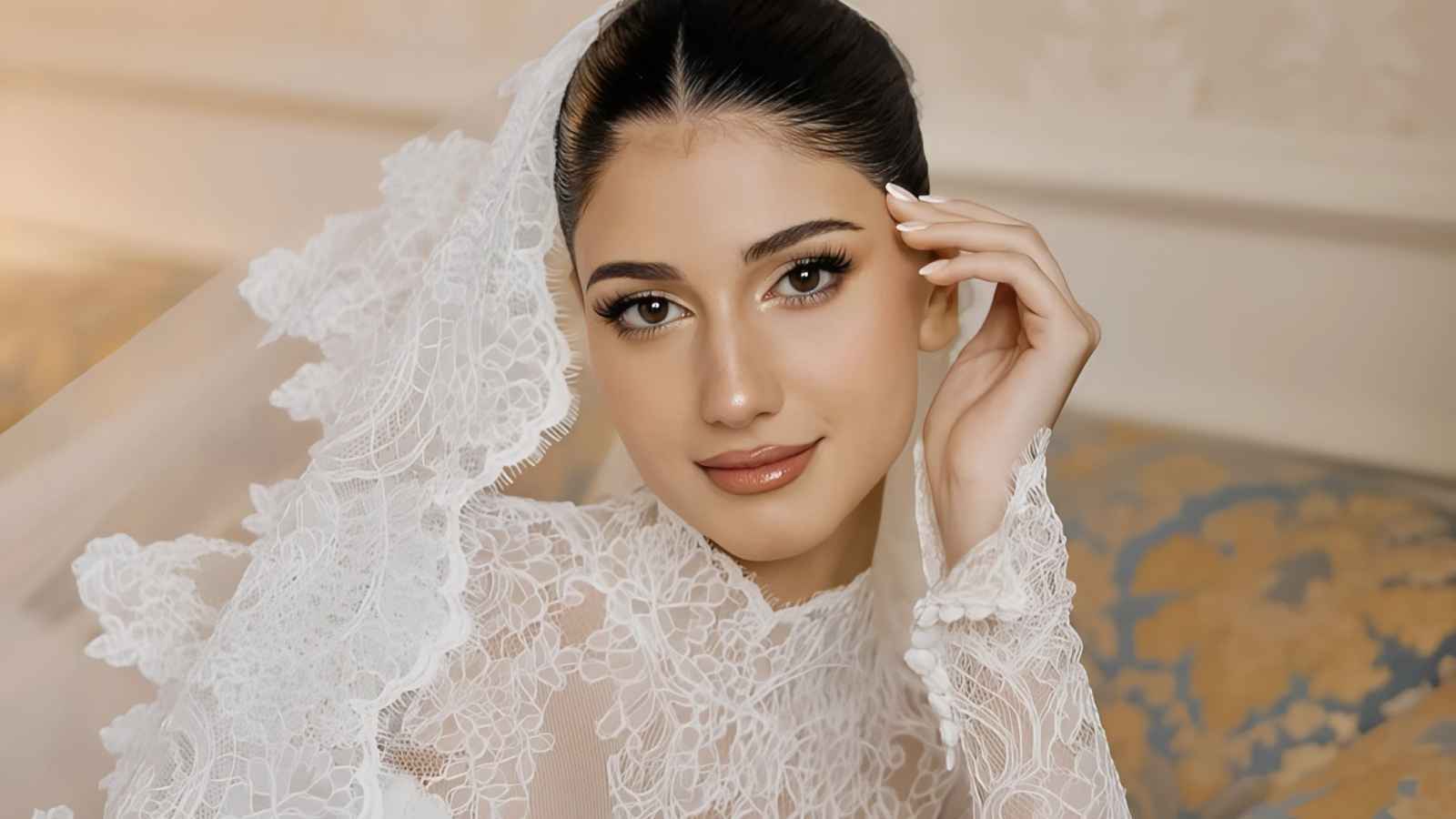 أطلت العروس بفستان أبيض ملكي بتصميم كلاسيكي فخم ، طى عليه الدانتيل الناعم الذي زيّن القسم العلوي بالامن من من الأكمام الطويلة إلى الياقة العالية ، بأسلوب محتشم وأنيق.