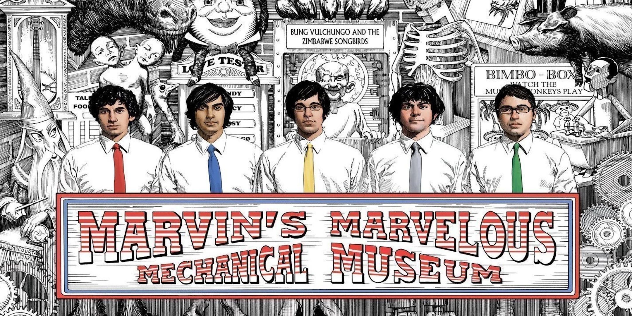 The Wildly Elaborate Album Cover is Entirely in Black and White, Save for Band’s Name, The Band Metmers’ Neckties, and the Album’s Name, which is a replica of the plastered above the archway that to the arcade. At first glance, the cover art is incredibly busy, but anyone who has been to marvin’s before Will Recognis that IT’S SIMPLY A Collage of Many of the Games and Machines that line the walls of the arcade. After the moving, one can be sura suns that the arcade’s integrity, showcase in Tally Hall’s Cover Art, Will Be Maintained in the New Space.