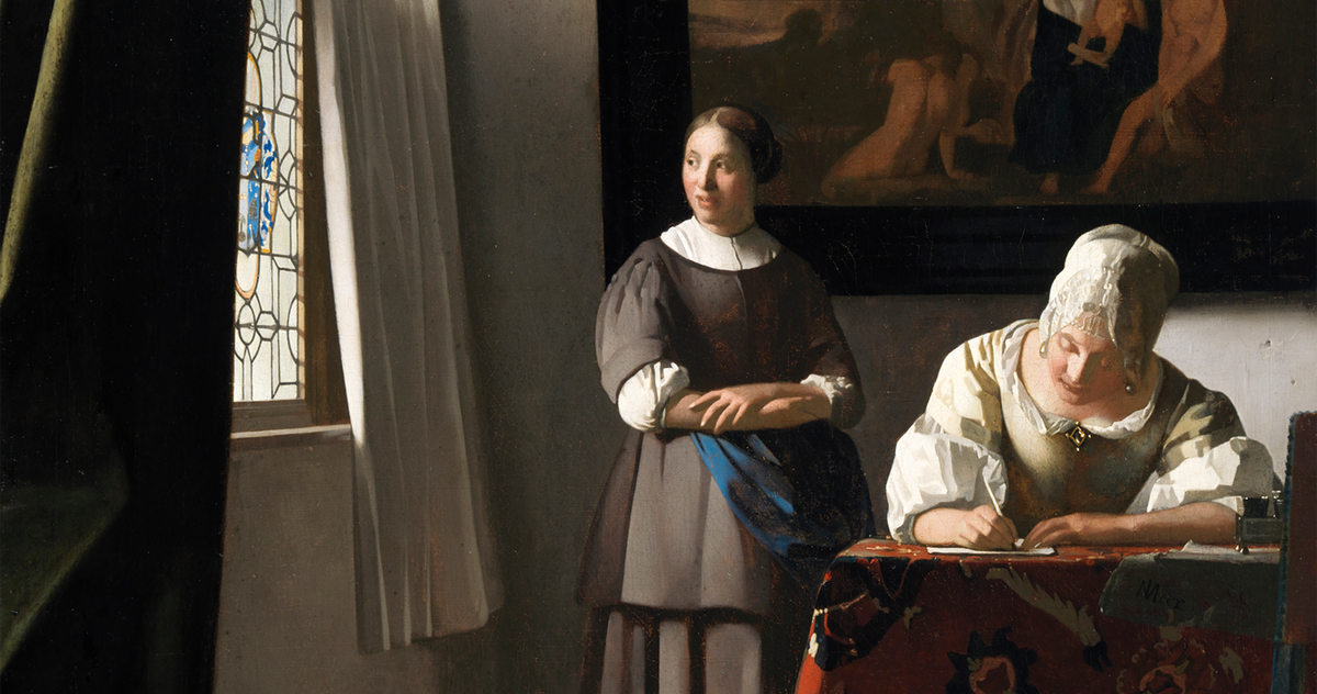 In addition to The love letterThe Show Features Woman Writing A Letter With Her Maid (from the National Gallery of Ireland) and the Frick’s Own Mistress and MaidEach Presented on a Deep-Green Wall. Begin on the right, with The love letter. We’re peering into a room from Dark Recesses, like voyeurs, the staged perspective echoing velázquez’s Las Meninas. A map intrudes on our view of a silken yellow dress and fur-trimmed jacket. She has haen playing a Curvy Lute, an Activity apparently interrupt by her maid handing her letter. They Lock Eyes ConspiracyLly; The Maid Is Smiling, but the Mistress’S Expression is more enigmatic. Is she Annoyed? Scared? Or already planning a Response, Coming up with a strategy?
