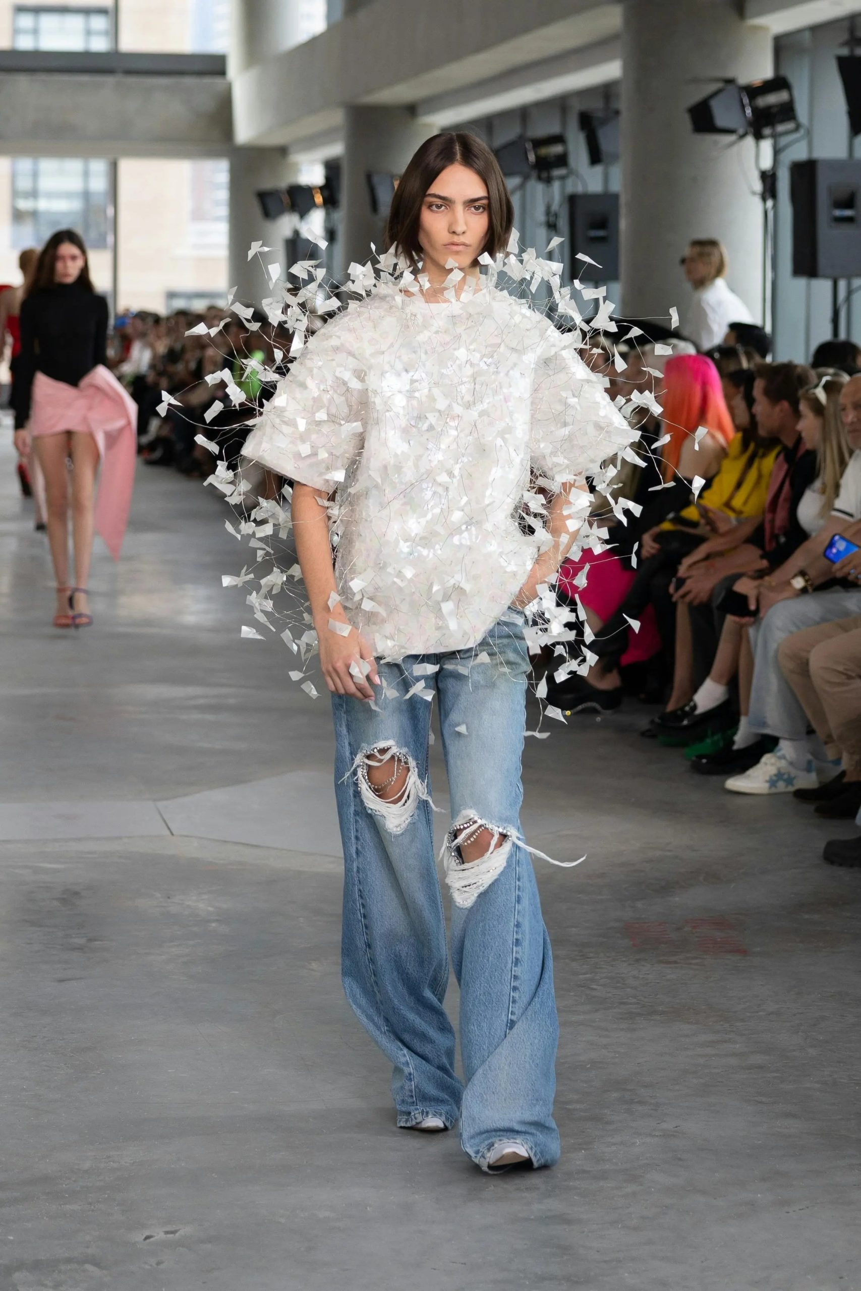 لم يغب الجينز الممزق عن المشهد ، بل عاد بإلالة أكثر جرأة وضوحًا. تم تقديمه بقصات متنوعة ، من الفضفاض إلى الضيق ، مع تمزيقات تفاوتة تتراوح بين الناعمة والجريئة ، ليعكس رlished متمردة لا تعرف القواعد.