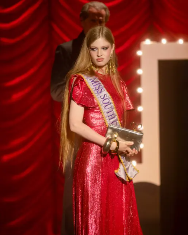 وسارت ويلسون على المنصة بفستان أحمر لامع قصير الأكمام من من مجموعة ربيع وصيف 2026 للعلامة التجارية ، مع معوج معوج معوج مع مع مع مع مع مع مع مع مع مع مع مع مع مع مع مع مع مع مع مع مع مع مع مع مع مع مع مع مع مع مع مع مع مع مع مع مع مع مع مع مع معاط الذهبية وحقيبة صيرة.