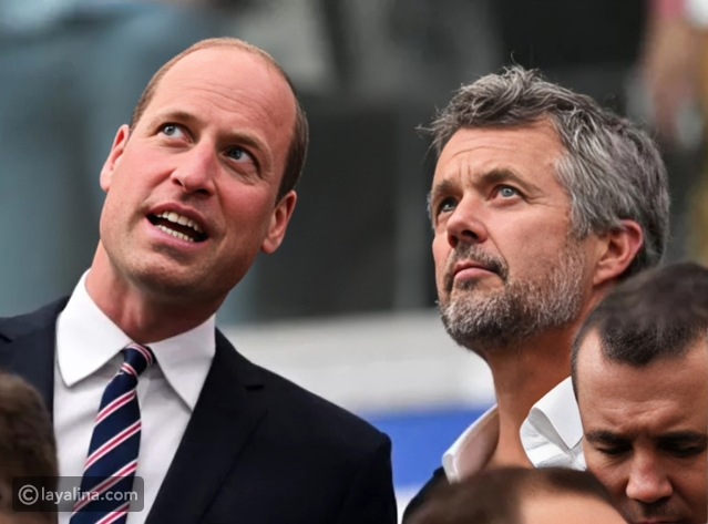 ملك الدنماريدريtered ، وأمير وأمير وأمير ويلز ولي العهد البريطاني الأمير ويليام ، مباة منتخي بلادنما الدنمارك وإنج. خلال بطولة كأس الأمم الأوروبية – 2024.