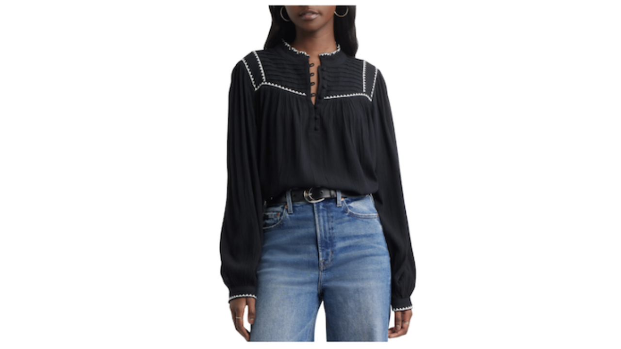 From the contrasting stitching and button and loop details at the neckline to the Billowing sleeves, this shirt dosesn’t Need a staff bag or jewelry piece-iYe-catching all on its.