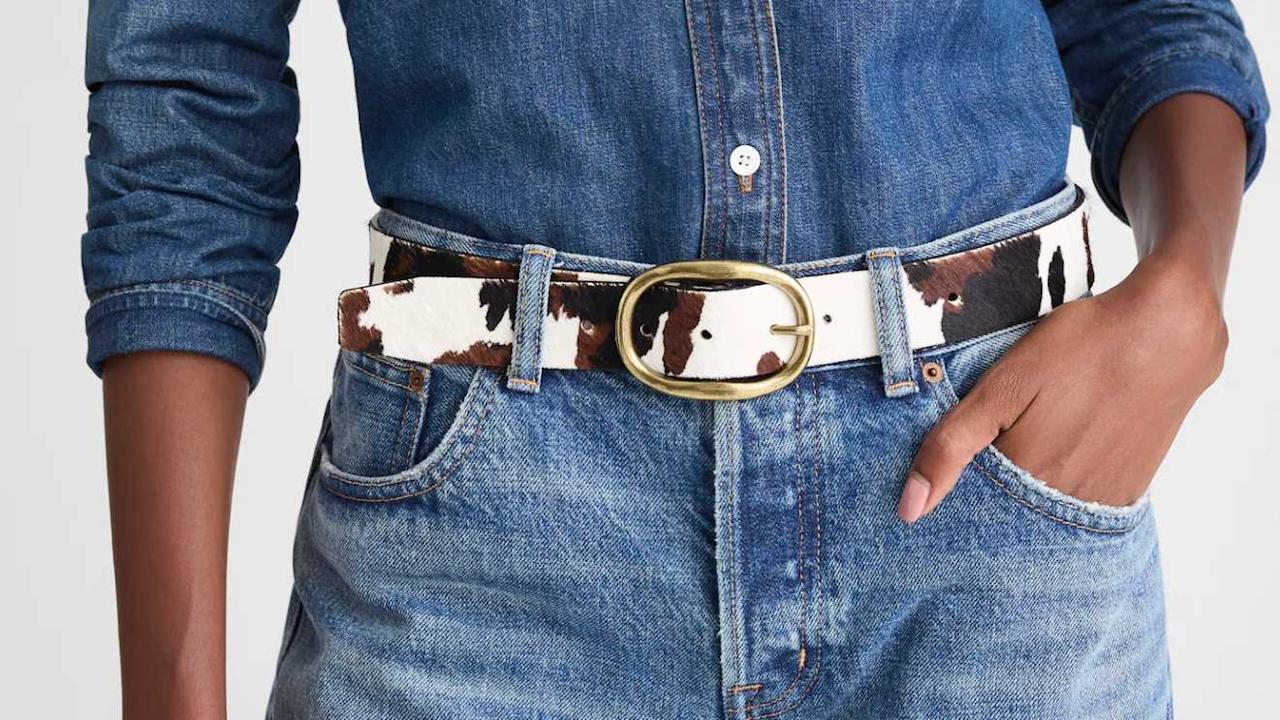 Tap into the cow-print trend with just a pop of it on this 100% leather belt. The Oversized Gold Buckle Makes IT Look More Chic Than Costum-Y Too. It will elevate any denim look, but bonus points if you go full western and pair it with bootcut jeans and a chambray shirt.
