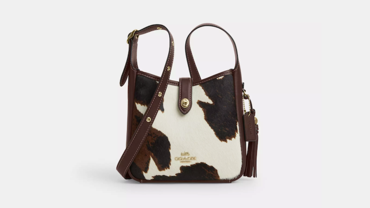 Leave it to coach to make a gorgeous cow-print handbag! This Calf Hair and Leather Bag has an adjustable strap that you can have Over your shoulder or across your body. At Nearly 8 Inches Tall and 7.5 Inches Wide, It ‘Solid Size for Carrying All of the Essentials Too.