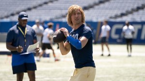 The show’s based on a real-life stunt pulled off by Eli Manning on his ESPN+ show Eli’s Places three years ago, when, as a joke, he got prosthetics and did a tryout for Penn State University’s football team using the Chad Powers alias. Only the head coach knew it was Manning. Have a look at how that played out: