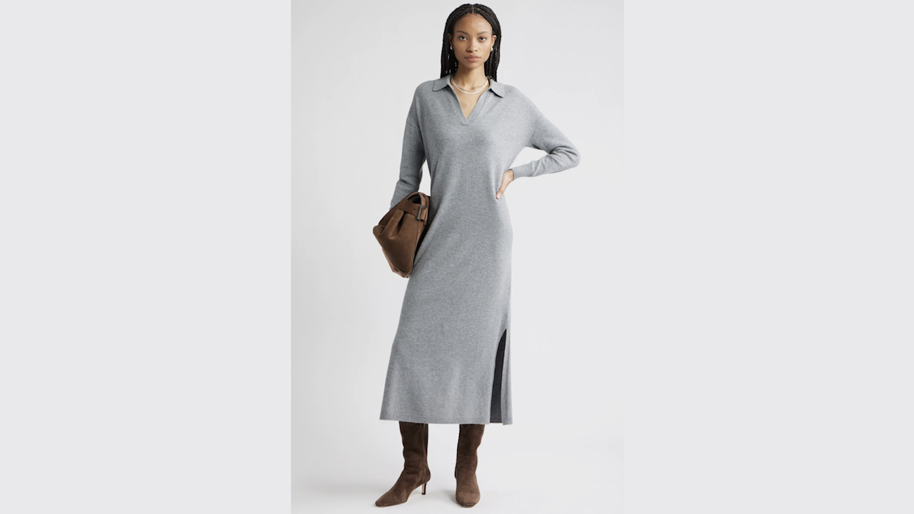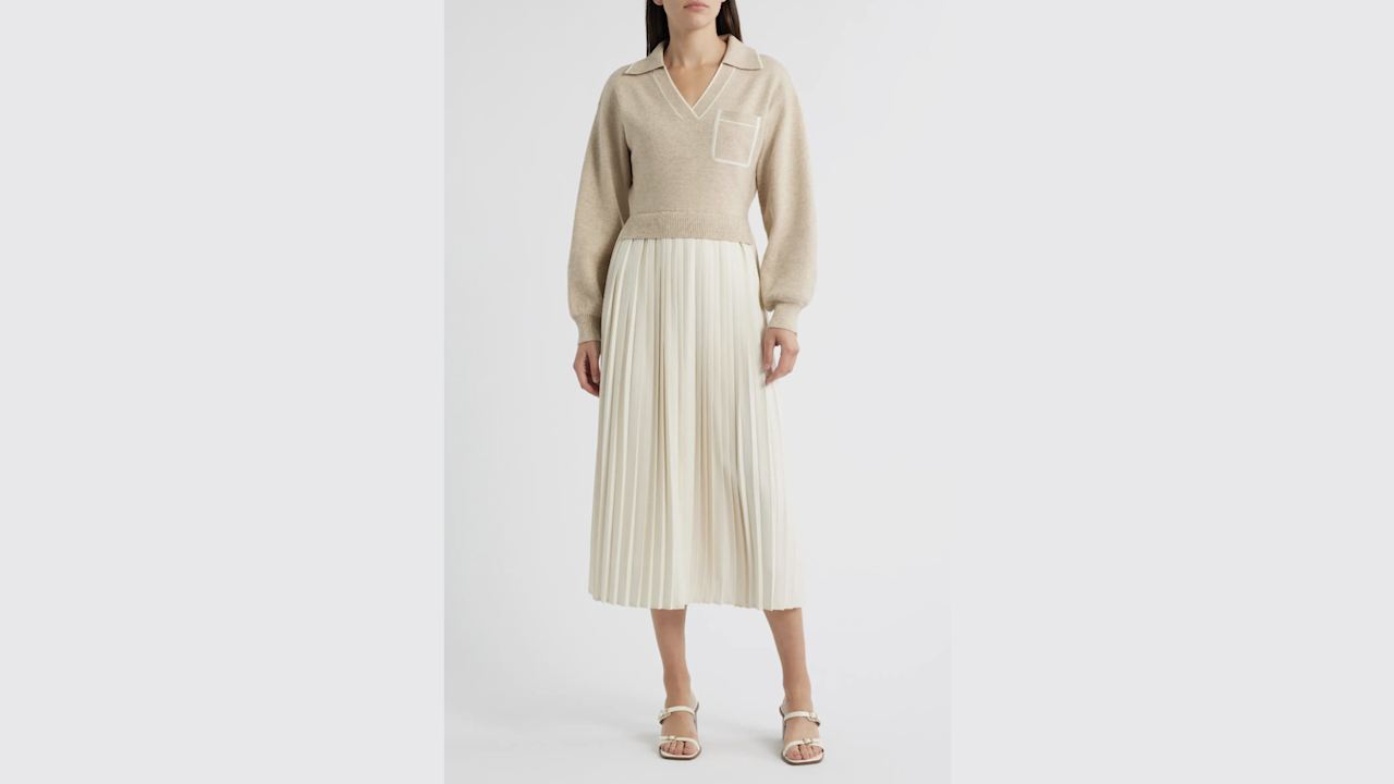 Here’s another twofer-style dress, except this one is all one piece-you can’t wear the sweater with the skirt. It coma in this “rich mom” shade of cream and beige that looks like you put together a sophisticated outfit, be really you just slipped this baby over your head and calmed it. No Shame in that!