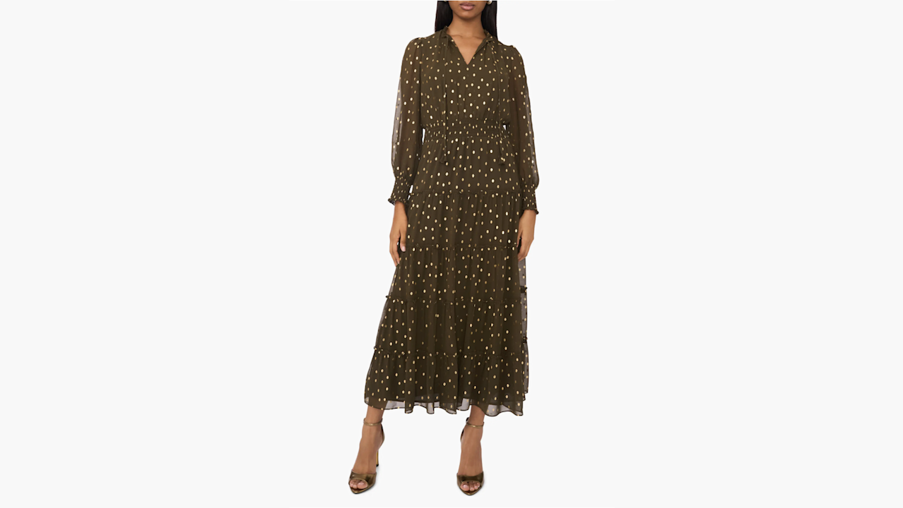 Looking for A Little Glitz and Glam? This Shimmery Maxi Has Gold Polka dots that are subtle Enough for you to wear any day of the Week. It ‘gathered at the waist and has a flowy skirt that was to look good on all shapes.