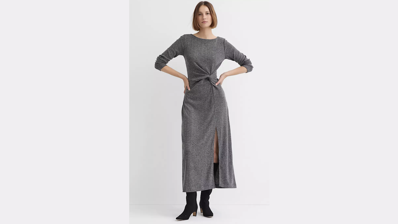Knit dresses generalyly Fall ino two Categories: Slim, Body-Skimming Styles or Baggy, Oversized Sweater Sacks. Not so with this beauty, which adds a twist detail at the waist so it has some shape with being too. It Comes in Gray and Green, and Petite Sizes too. Wear it with tall boots like the model, or pop on sneakers or balllet flats to keep it casual.