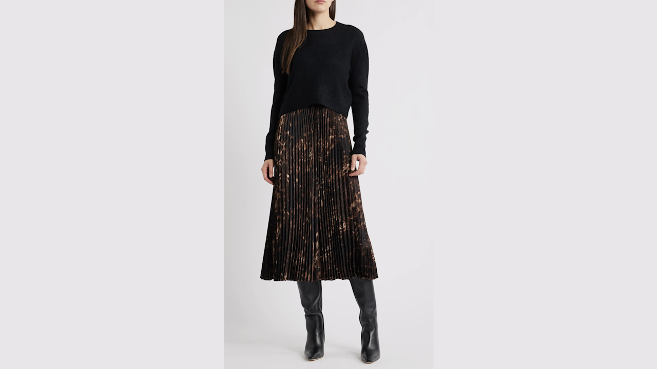 This Dress Comes with a sweater, so you get two ittems for the price of one! Yes, it’s a pleated slip dress (in a gorgeous but slightly muted leopard print) with a Black Crewneck Sweater on Top. The skirt is forgiving enough to mask any problem are, and the layered sweeater Can Help Make Your Waist Appear Smaller. It also loooks a lot like an allsaints style that costs nearly $ 500.