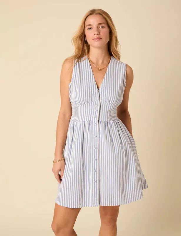 Another great picking is the White and Blue Striped Starlight Mini Dresswhich is £ 79 and manages to be bot Flattering and floaty. IT HAS A FITTED PANEL AROUND THE WAIST TO ACCENTUATE YOUR FIGHE, WITH A FLARED MINI Skirt and Sleeveless Body, Keeping You Cool and Breezy in the Hot Weather.