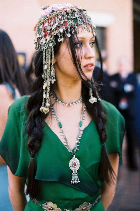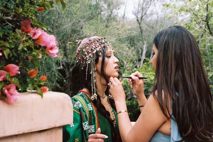Marwa: Green is the traditional color of Afghan weddings, and I knew from the beginning I wanted to do something semi-traditional. It’s really hard finding a green dress; a lot of them were almost matronly or looked like vacation dresses. The one I wore is actually Ralph Lauren, a real American heritage brand, which I found at Neiman Marcus in L.A. It felt elegant, and I liked the silhouette a lot. My mom found a traditional Uzbek robe in Afghanistan, and she got parts of it custom-embroidered. All the jewelry was vintage pieces she found and took to craftsmen and had refurbished. Together, we designed how we wanted these pieces to look as a cohesive set. I knew I wanted braids in my hair, because I was inspired by this picture of Kirsty Hume getting married in the ’90s in Scotland in a headpiece with long braids. I did my hair and makeup myself. I had a vague Penélope Cruz reference in mind, but then, I always do.