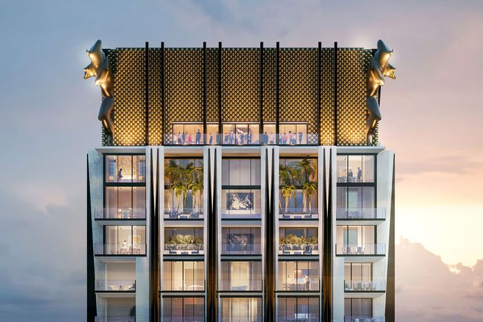 A Reinant of the Dolce & Gabbana Tower in Miami, with Gold and Bronze Highlights on the Facade and an Open-Amenenity deck on Top. Photo: Courtesy JDS Development Group and LL & CO