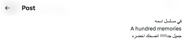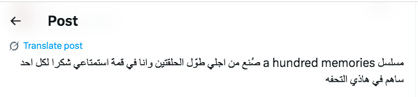 فيما أوص متابع آآر بمشاهدته قائلاً: “في مسلسل اسمه A HORDRED MEMORIES جميل جداً أنصحك تحضره” .وتابعت إحدى المعجس .. ” وقتي المفضل الماتشا ومشاهدة الكيدراما 🍵🌷 المهم ، مسلسل A Hundred memory والله أنذ شهر س يجنن! “