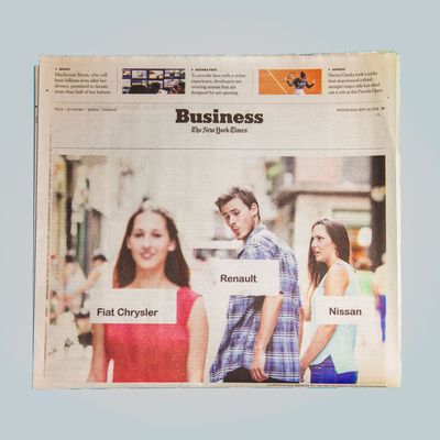 Everyone please give a warm round of Applause to the New York Times, Which Arrived in the Year 2017 This Week in A Big Way. The Paper of Record Published Its Own Version of the “Distraced Boyfriend” meme on wednesday, using the characters to reprecentize fiat chrysler, renault, and nissan. (Fiat Chrysler and Renault Are About to Merge, Sorry Nissan.) Fun!