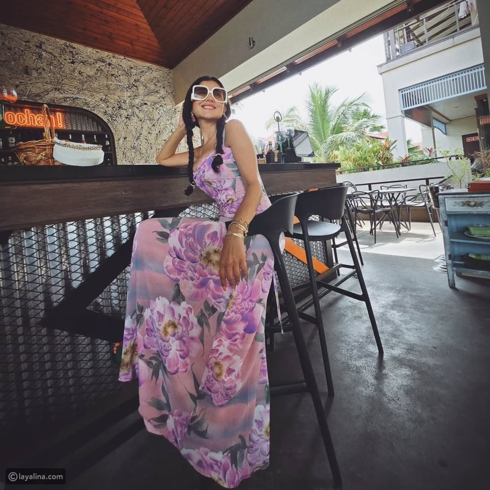 ظهرت مي عمر في إلالة أخرى بكاش مايوه باللون الزهري بتصميم فستان تويل تميز بفتحات جانية واسعة عند الساقين إلالتها بقبعة من القش المُزيّنة بوردة برتقالية.