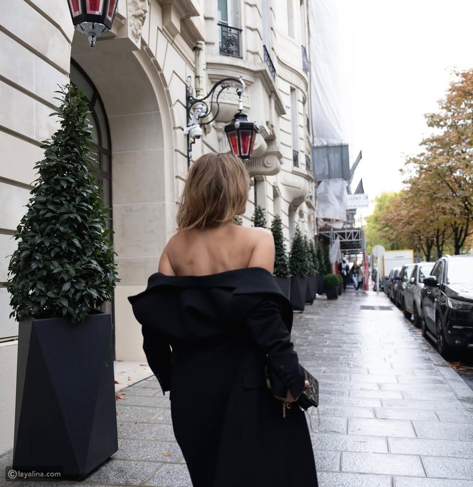 Nelly posted her photos via her official account on “Instagram”, in front of one of the famous hotels in Paris, during which she appeared in a black dress Open-shouldered, with a long coat of the same color, and a small bag with a luxurious design, to give a complete look from black with a new look. and different.