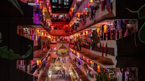 A building in Mumbai city lit up with paper lanterns hung outside houses