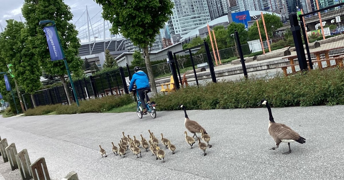 Photo by Sheila Webber; geese babysitting their friends’ goslings, Vancouver, Canada, May 2024