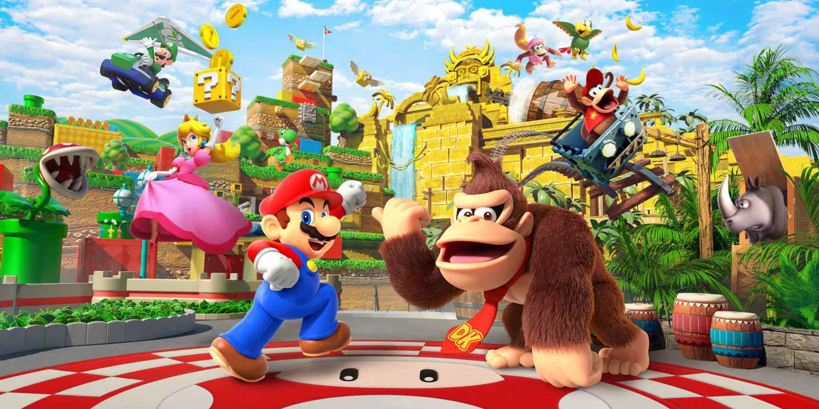 Nintendo Mario and Donkey Kong inviting people to Orlando park with other Nintendo characters