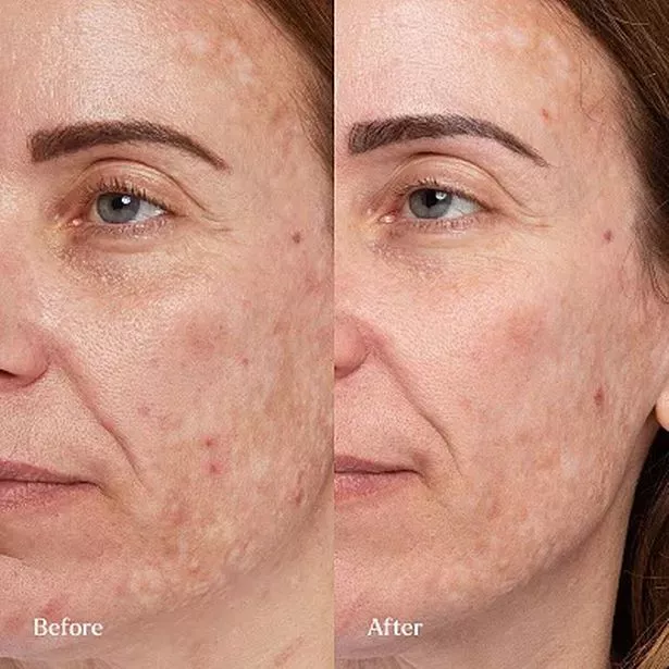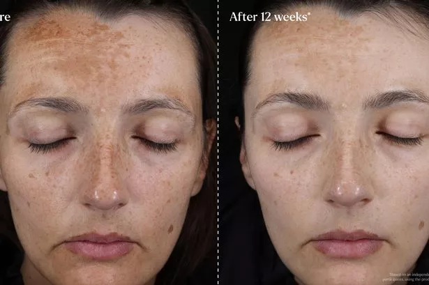 The image at the top of the page shows one tester’s skin before and after using this Skin Rocks serum for 12 weeks, with their facial pigmentation noticeably diminished.