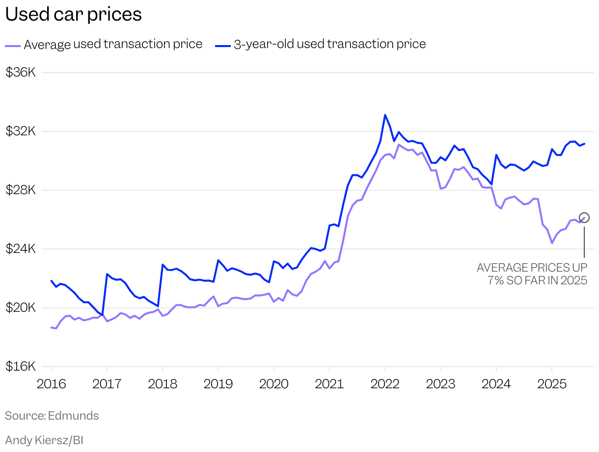 There’s sticker shock, and then there’s whatever is happening with America’s used-car market. Prices for a slightly-less-than-new-car have been soaring over the past few years. Before the pandemic, the average price for a 3-year-old vehicle topped out at a little over $22,000. In 2025, the cost is upwards of $31,000. And according to Edmunds, which tracks the car market, that number may soon sound like a bargain.