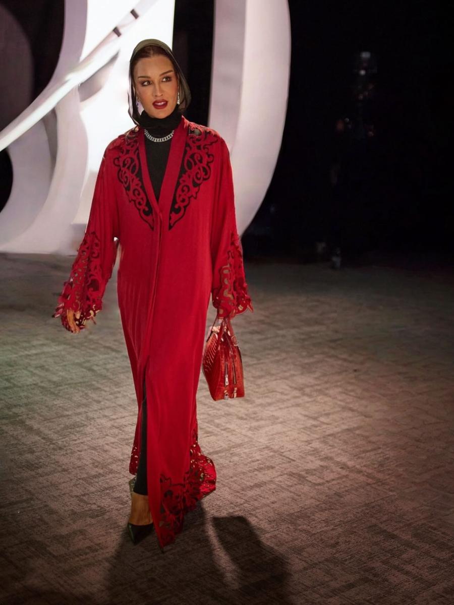في زاحور بارز إلى الملتقى خريجي عصرة قطر 2025, لفت الشيخة موزا الإنظر ب على على جمعت بين الحداسة والحوية Qatar, where she wore an elegant robe with lace in vivid red, styled it elegantly over a simple black dress, with a hijab from breath