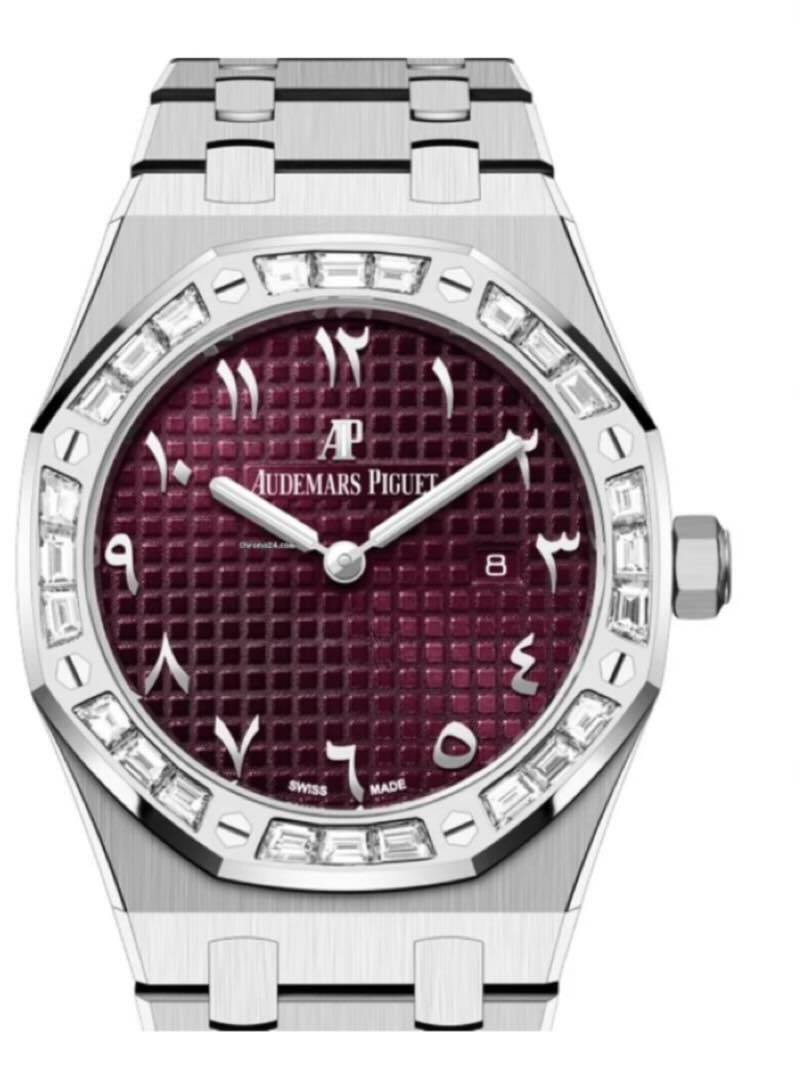أكملت الاوردة بساعة تحمل نفس الطابعة العربية clearly, among them a rare watch from Audemars Piguet Royal Oak Qatar Editionin the case of the white gold, the diameter is 33 mm, and the crown is gold, and the crown is red, dark red, and decorated with Arabic figures. على الساعة لمسة ترائية المعلومات تعميزها عن نصف العلماء لوحة. اما المجوهرة الالماسية العالمة عزعت من فخامة الذهور.