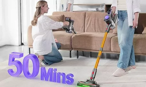 The vacuum, which is sold in ‘purple gold’, has a run time of 50 minutes, meaning there is no rush when doing house chores. If shoppers need to re-use it again quickly, the battery charge time is four hours.