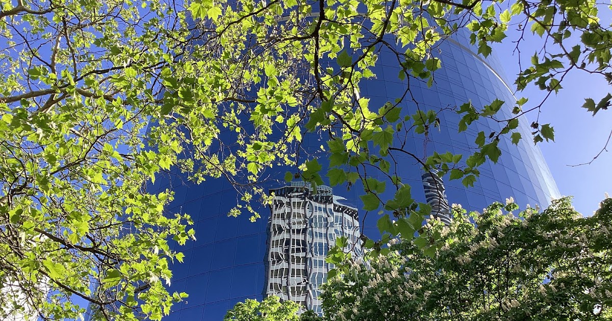 Photo by Sheila Webber: spring trees and reflections in a glass skyscraper in downtown Vancouver, Canada, May 2024