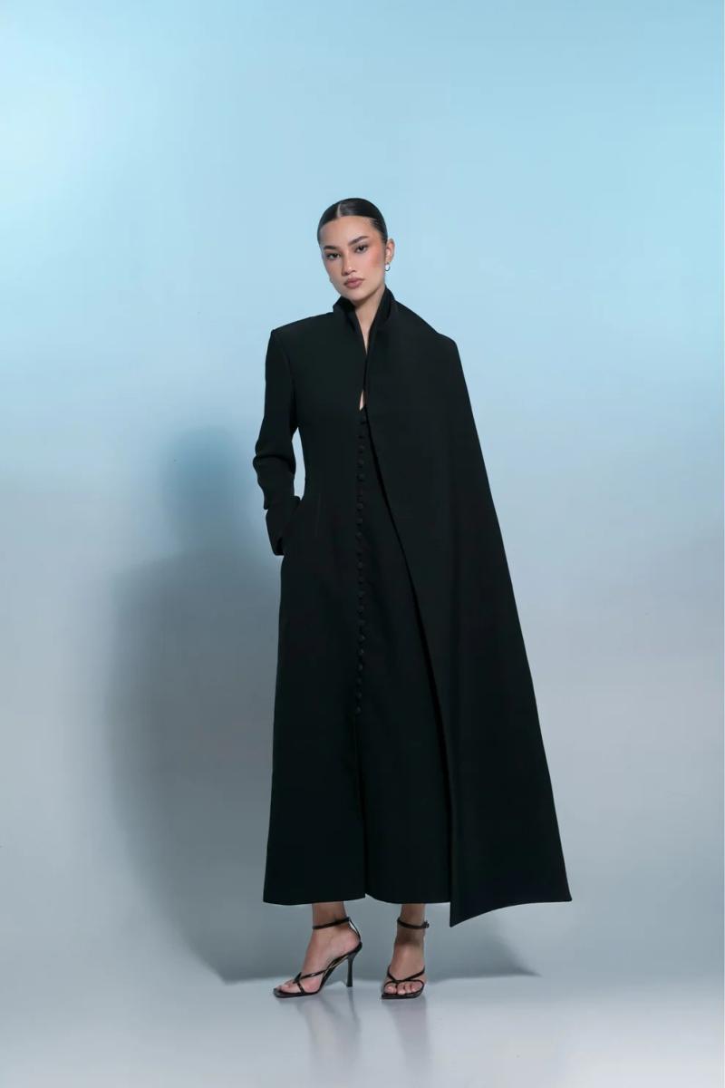 عرض المزيد يارا النملة في عرض المستحروة السعودية منا الشبل مرتديا فرصةً متعملة Crepe collar caped buttoned dress صنعد من القرب الكريب, جاءة بلون احدر بستيل حادئ.