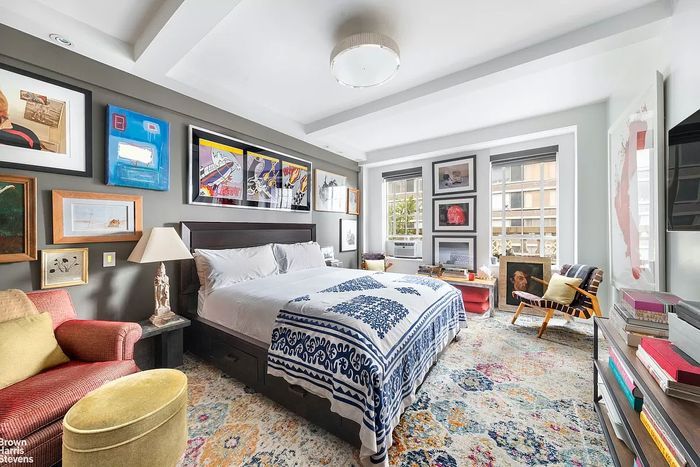 The bedroom in this listing photo is filled with art and a bed that Barrett once exclusively lined with Leontine Linens. Photo: Brown Harris Stevens