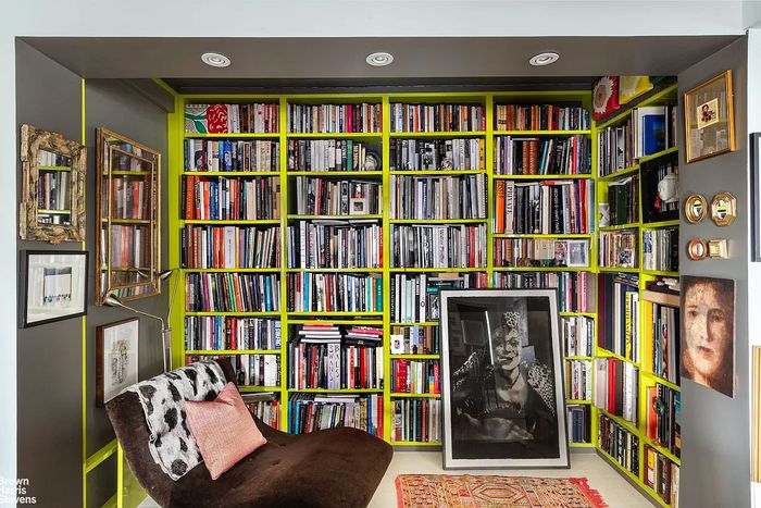 The listing photo shows the striking lime-green built-in bookshelves stuffed with coffee-table art books. Photo: Brown Harris Stevens