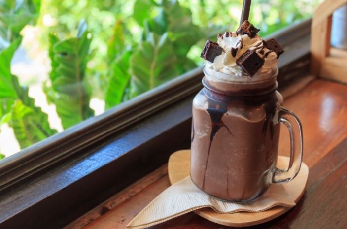 قومى بسكب الميلك شيك في كوس التقديم دائى رشه من الكاكاو على الوجه