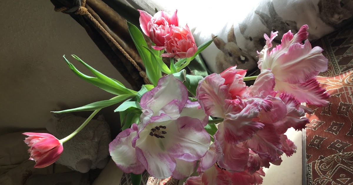 Photo by Sheila Webber of parrot tulips in a Radford vase in March 2024