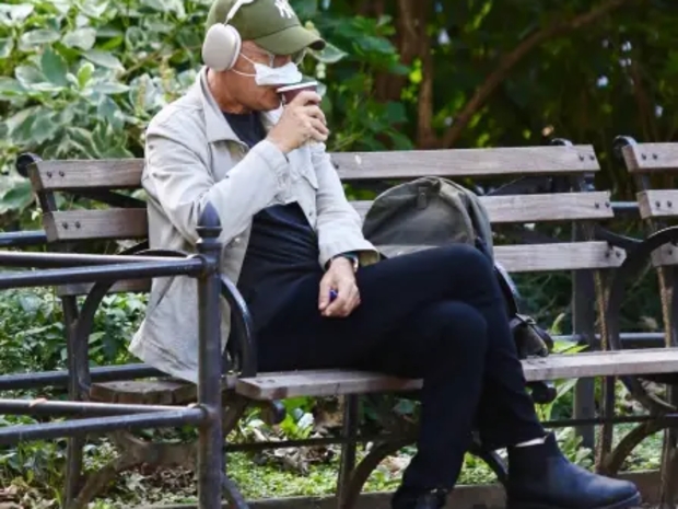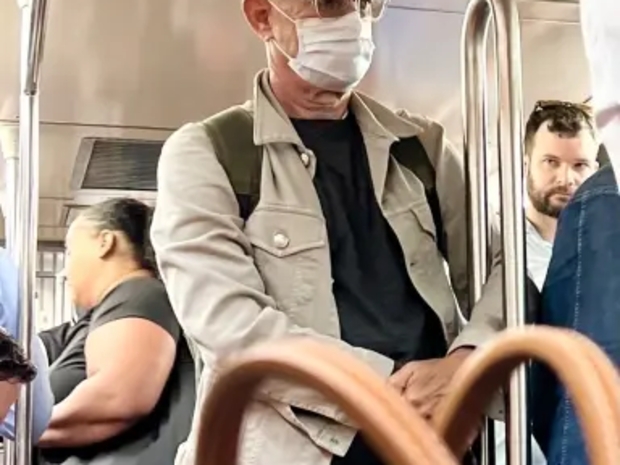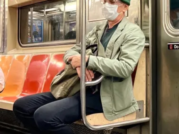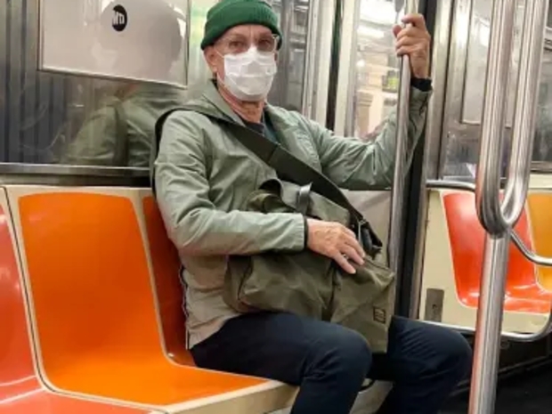 اختر توم HANكس, 69 years old, أن يستقل القطر 6 في قلب منهاتن, هد شوهد جالسً على احد المقائد دون أن ينتبه عليه على الرقباف في بادقة.