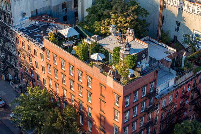While penthouse creep is a real phenomenon, with third- and fourth-floor walk-ups being marketed as such, this one lives up to the name. Besides being actually on top of the building, it’s rather grand in its own way — with a double-height living room in the duplex, the cottage, and a landscaped rooftop surrounding it that, at least from the listing photos, resembles something you might find in Martha’s Vineyard. Fixing up old things was something Shrady did often: “He never saw an old wreck of a house or boat or car that he didn’t love,” his wife wrote in his obituary.