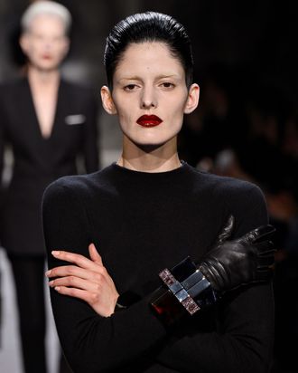 Models wore Tom Ford runway lip color in Scarlet Rouge, a cool, bright red, topped with Tom Ford’s gloss luxe in Disclosureanother standout red. The gloss was added exactly five minutes before showtime so it could have a glassy look on the runway. “Kissable” lips was the goal. Our fashion critic, Cathy Horyn, said the lips looked “as if Dracula gave them a smooch,” so the team got their point across being kissable. The bright lips were contrasted by super-sculpted skin using Tom Ford’s blurring foundation. For the last alluring beauty moment, models wore a Tom Ford scent down the runway, Oud Wooda fragrance with notes of pink pepper and amber. It has a bit of spice to it, but it’s also sexy. I’d wear this for date night was the first thing I said when I smelled it. Could the audience smell the models at all? I’m sure they couldn’t. But for a show that wants to seduce, all senses must be touched on, so why not douse the models in a desirable scent?