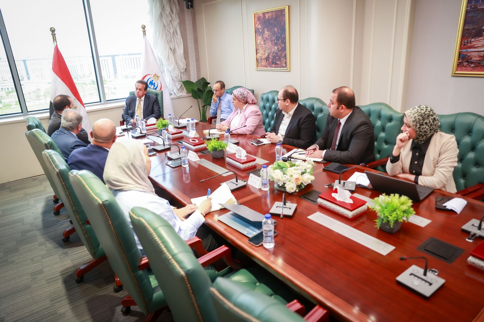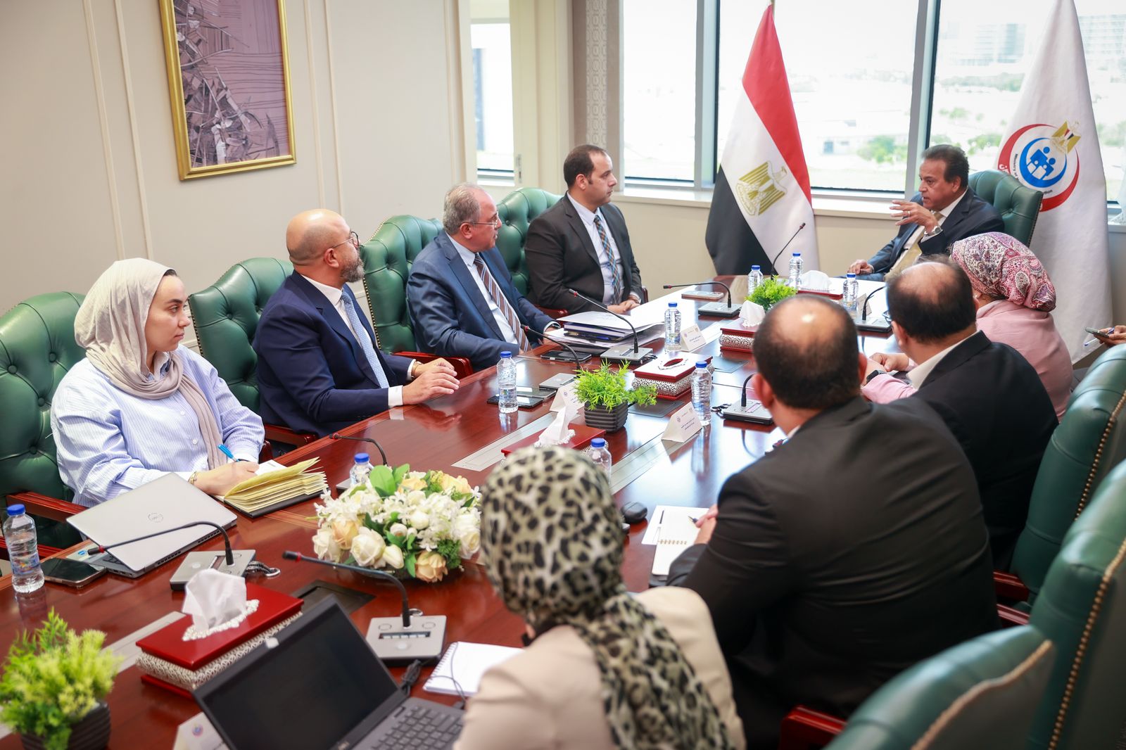 The meeting was attended by Dr. Maha Ibrahim, Head of the Specialized Medical Centers Administration, and Dr. Mohammad Abd al-Hakim, Head of the Department المركزية للتب للتحافيمي, والدكتور احمد رزق, نايب ريس امانة الللطب حقيقة الشعريقة