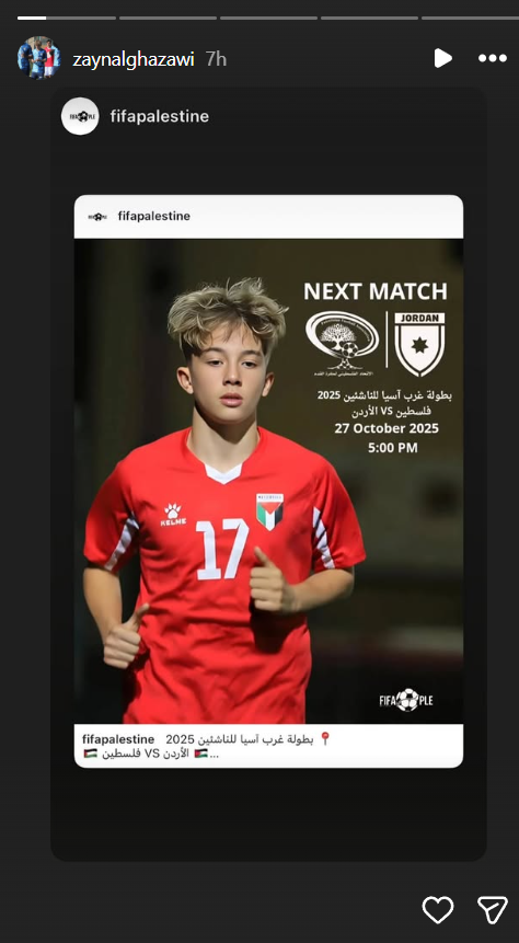 It is decided that Zain al-Ghazawi will compete with the Palestinian national team for the first match in the 2025 West Asian national team in front of the Jordan national team on the 27th. October 2025 عند الساعة فيمة مساعً بتوقيت فلستينة, وست كبير ترقب من المشجعين لموهبته الساديدة.
